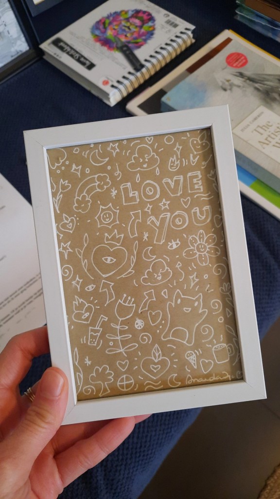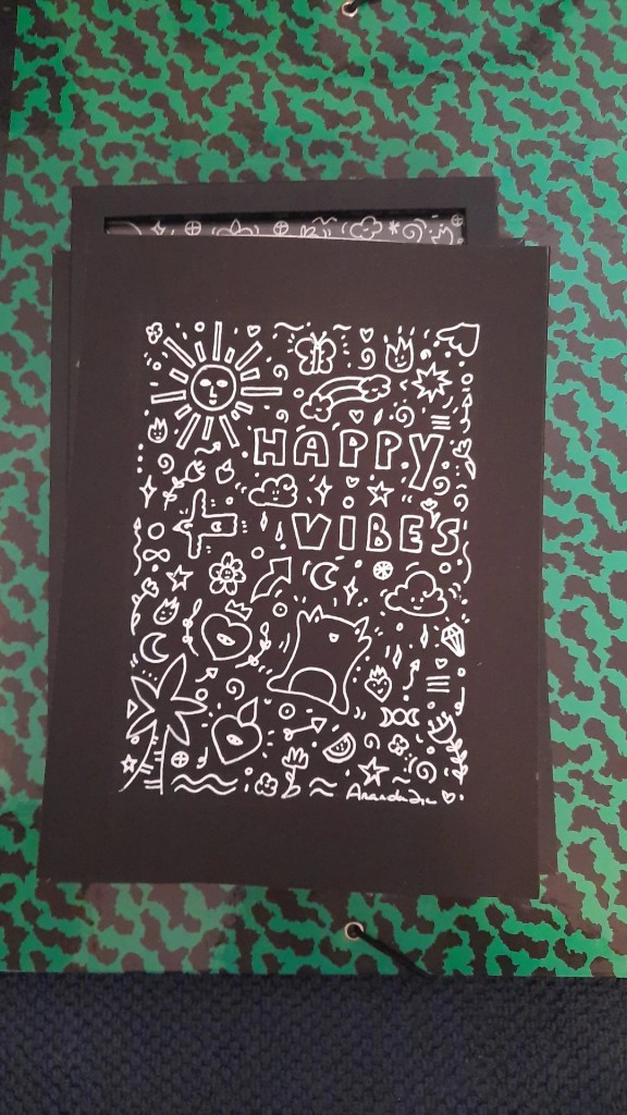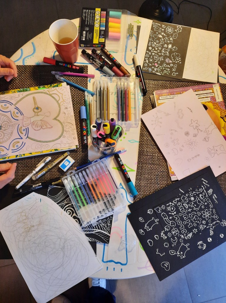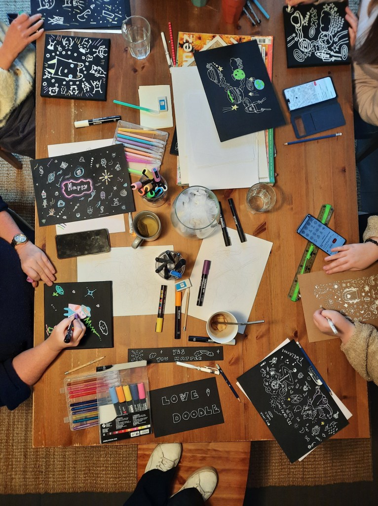 Op zwarte ondergrond gaan we met witte pen en stiften leuke doodles maken en met kleur opvrolijken. Verschillende thema’s zijn mogelijk. Beetje bij beetje kan je jouw unieke stijl ontdekken en wat er wil geboren worden. Ik maak bv veel doodles met dieren en symbolen, maar alles is mogelijk. Je leert je innerlijke wereld vertalen via dit medium en hoe dit praktisch aan te pakken. Deze workshop is voor elke niveau toegankelijk.